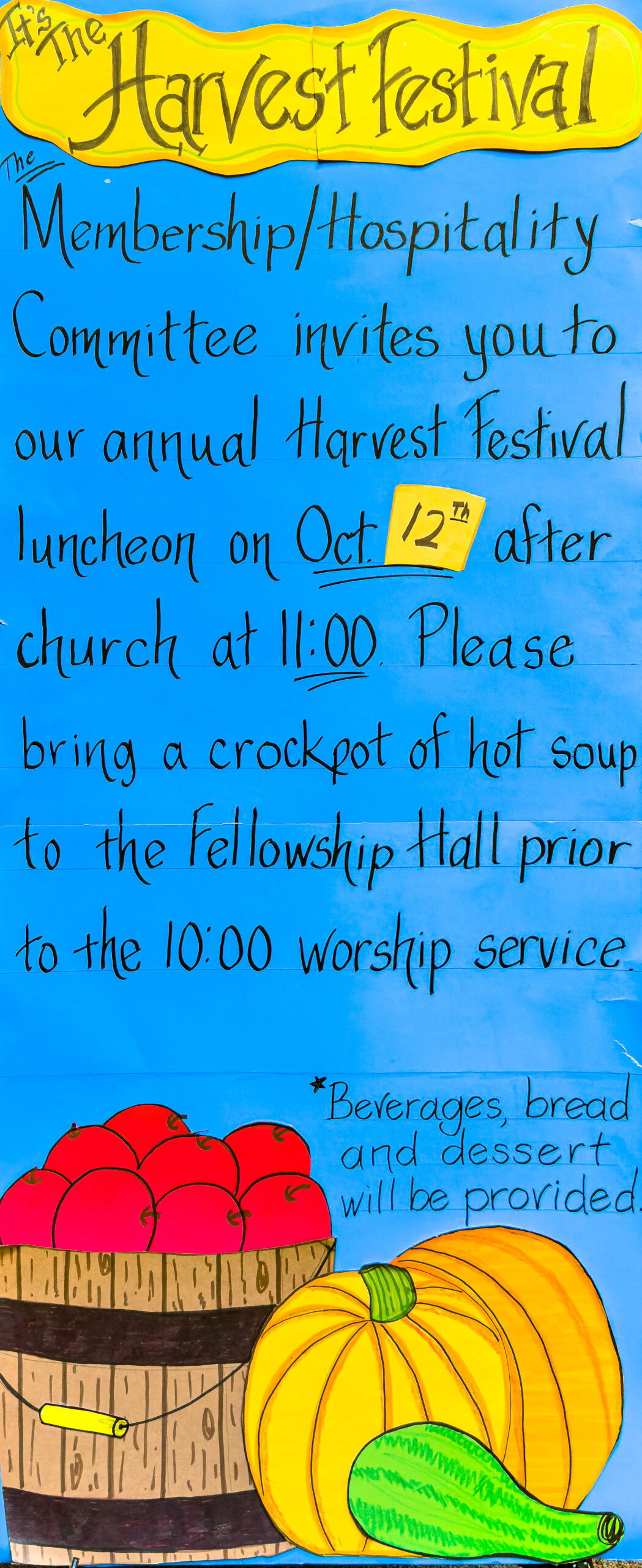 A colorful poster for the Harvest Festival luncheon invites attendees to bring a crockpot of hot soup before 10 a.m. and mentions beverages, bread, and dessert will be provided. Illustrations of apples and pumpkins decorate the bottom.